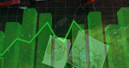 Image of financial graphs and data over warehouse with trash. Waste, rubbish, economy and finance concept digitally generated image.