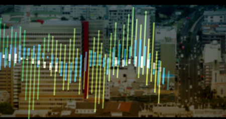 Showing multicolored vertical data bars overlaying cityscape downtown, with buildings and vehicles. Urban, skyline, data, visualization, architecture, infrastructure, digital