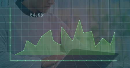 Holding tablet, man in light brown knit sweater analyzing holographic line chart at modern office. Technology, data visualization, innovation, professional, business, contemporary, analytics