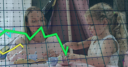 Image of financial data and graphs over diverse coworkers in office. Business, finance, economy and cooperation concept digitally generated image.