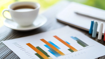 A high-resolution image of a financial report featuring colorful bar charts and graphs, placed on a desk with a calculator, notepad, and a cup of coffee.