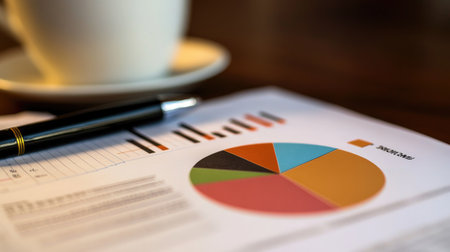 A close-up of a pie chart in a financial report, with each segment clearly labeled and color-coded, displayed on a desk with a cup of coffee and a pen.