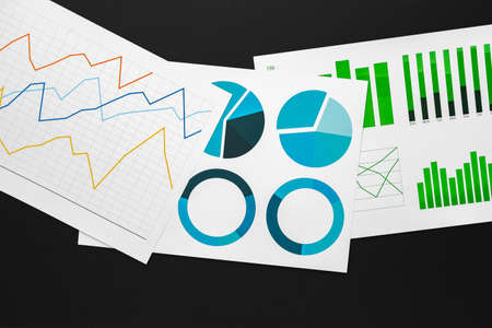 Printed graphs and laptop on dark gray surface