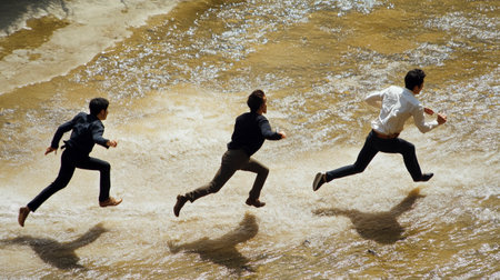Business people running in the water of a river. Motion blur.