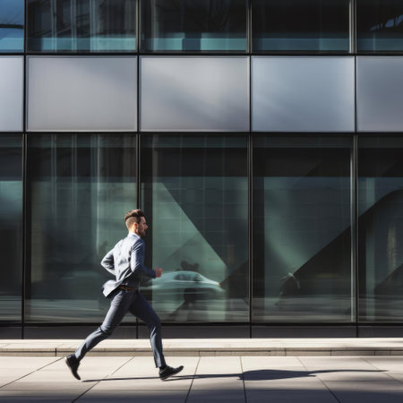A businessman runs through a city street with a briefcase, captured in a motion blur.