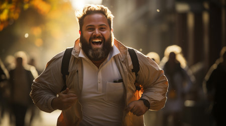 A businessman in a suit and tie is running down a street with a big smile on his face.