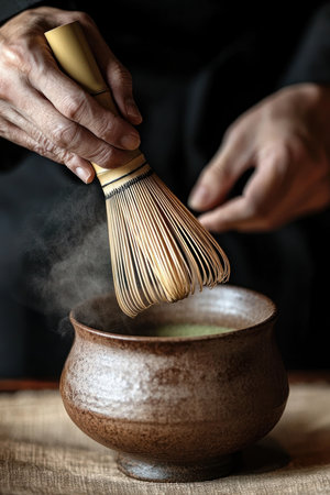 hands of person whisking matcha in ceramic bowl with bamboo whiskey during traditional tea ceremony