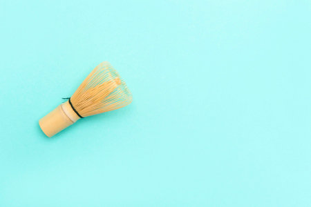 Matches tea whisk on a blue background. Super drink, Chinese tea for health. Top view. Copy space. High quality photo