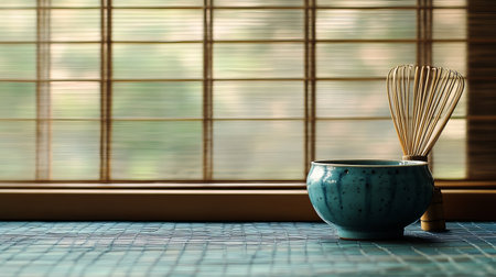 Experience the serene beauty of a Japanese tea ceremony with this elegant arrangement of utensils, featuring a green bowl and a bamboo whisk, complemented by soft natural light.