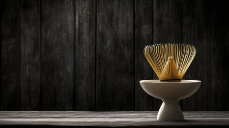 An essential tool for the traditional Japanese tea ceremony, this handcrafted bamboo chasen rests on a minimalist gray surface.