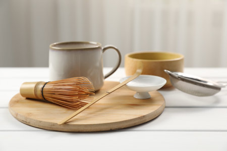 Making green matcha. Ceramic cup, bowl, bamboo whisk, scoop and sifter on white wooden table, closeup