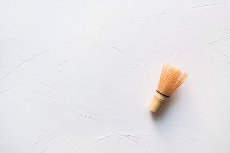 Bamboo whisk for cooking green matcha tea on white concrete table. Top view. Space for text.