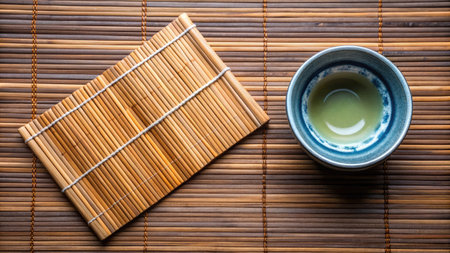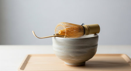 Discover the serene art of matcha tea preparation featuring a bamboo whisk in a traditional Japanese bowl, set on a natural bamboo mat, evoking calmness.