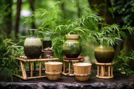 bamboo cups filled with sake surrounded by greenery, created with generative ai