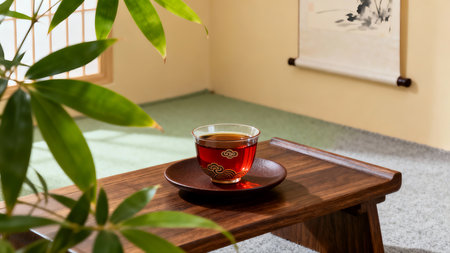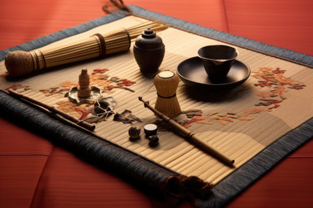 tea ceremony utensils displayed on a tatami mat, created with generative ai