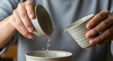 Water pours into a small bowl, generating gentle ripples on the calm water surface in a peaceful setting, evoking tranquility and mindfulness.