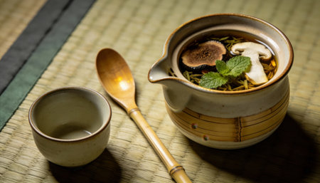 Herbal tea in a ceramic pot with fresh mint and a mushroom slice presented beside a small cup and wooden spoon on a tatami mat, with clean empty areas suitable for text or design placement