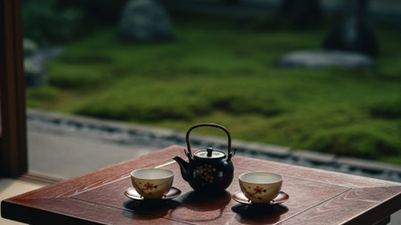 A cinematic environmental wide shot of a traditional Japanese still life. A small Kyusu teapot and t
