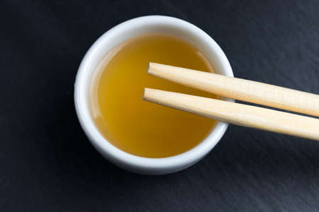 Fish sauce in small white bowl with chopsticks on black kitchen slate plate background. Typical asian cuisine spice.
