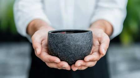 A small, dark gray stone bowl with a textured surface is held gently in open hands. The bowl appears to contain a liquid.