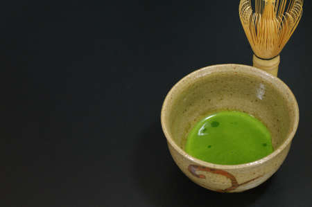 Japanese matcha green tea in a ceramic bowl with tea whisk