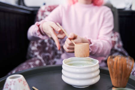 Woman wearing pink clothes sitting at the table and preparing matcha tea