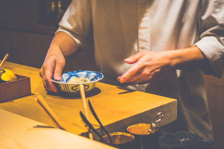 a japanese chef's hands preparing dishes in a kaiseki omakase restaurant counter