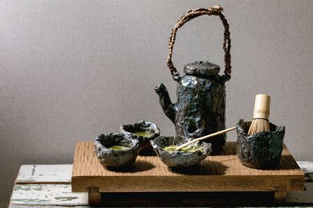 Japanese matcha green tea in craft ceramic cups with matcha powder, bamboo whisk, ceramic teapot on traditional wooden japanese table.