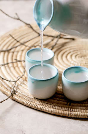 Sake ceramic set for traditional japanese alcohol drink rice wine sake pouring from pitcher in three cups, standing on straw napkin with dry branches over beige texture background.