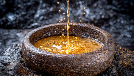 Velvety amber liquid cascades into a weathered stone vessel, creating lively splatters that highlight its rugged, textured surface and artisanal charm