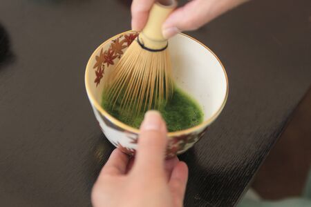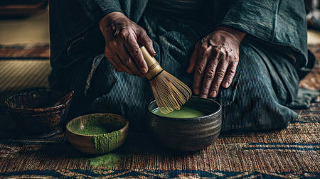 This image captures the essence of a traditional Japanese tea ceremony, highlighting the meticulous preparation of matcha with a bamboo whisk in a tranquil setting.