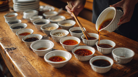 A visually appealing arrangement of various sauces and condiments in small bowls, showcasing a rich diversity of flavors and textures for culinary adventures.