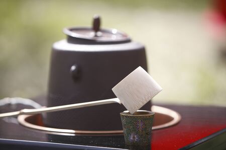Matcha teacups and tea utensils preparing Japanese tea ceremony in a Japanese-style room