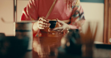 Hands of woman in traditional Japanese tea house, kimono and relax with mindfulness, respect and service. Girl at calm tearoom with matcha drink in cup, zen culture and ritual at table for ceremony.