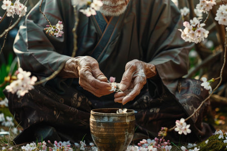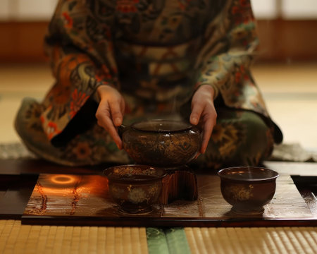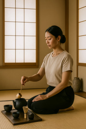 A woman performing a tea ceremony ritual in a tranquil Japanese setting with traditional elements