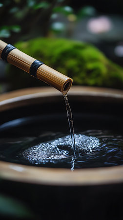Natural scene displays water pouring from a bamboo spout, striking a pool in a stone basin creating ripples with mossy vegetation in the background.