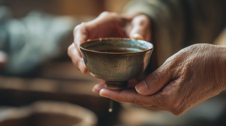 Empty ceramic tea bowl placed on a wooden table, with a blurred Japanese man in traditional kimono sitting in background, ready for a tea ceremony