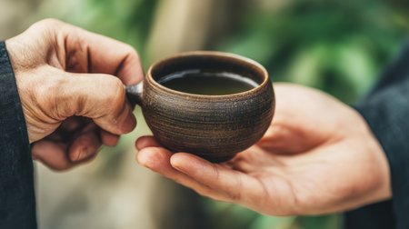 This image was generated using AI. Two hands meet in an intimate and supportive gesture while one A person hands a cup of tea to another in a vulnerable situation. The warm and intimate composition conveys empathy, care, and human connection, ideal for campaigns on emotional health, coexistence, hospitality, and community values. Perfect for editorial, social, and cultural content that promotes well-being and inclusion