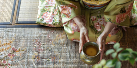 A woman dressed in a traditional kimono is pouring tea from a teapot into a cup, A traditional tea ceremony in Japan, AI Generated