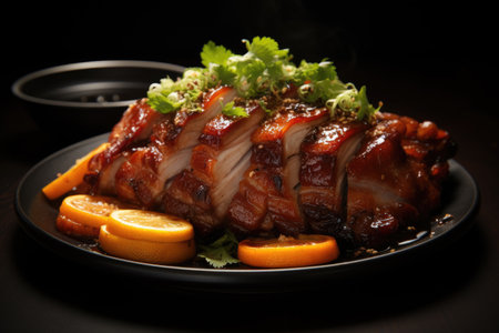A black plate topped with meat and orange slices. Cantonese roasted pork.