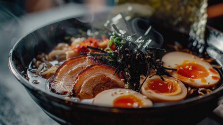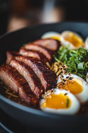 savory ramen noodle bowl with pork, soft-boiled eggs, and garnishes