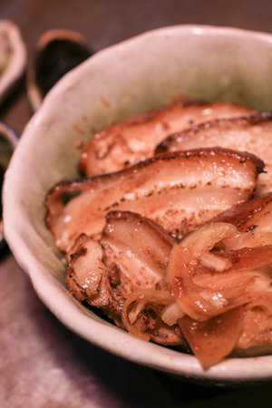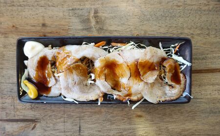 Top view of japanese pork with sweet soy suace on timber table