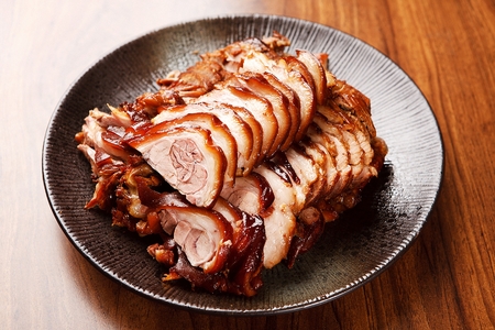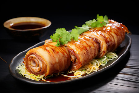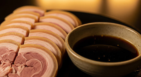 Slides of Japanese Style Chashu pork on the black plate with spicy and sweet sauce