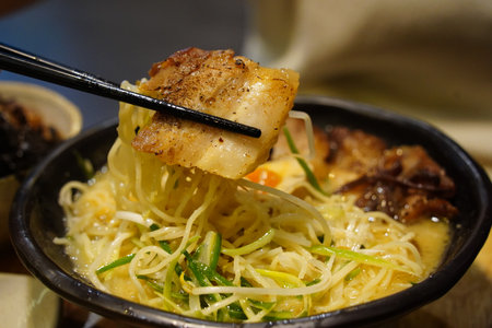 Close-up of Japanese Ramen Noodles with Pork Belly Lifted by Chopsticks