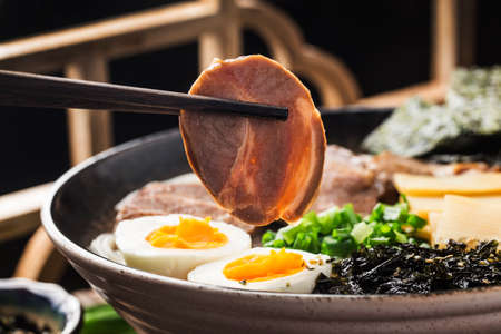 Ramen Japanese noodle soup food with noodle and pork on wooden table