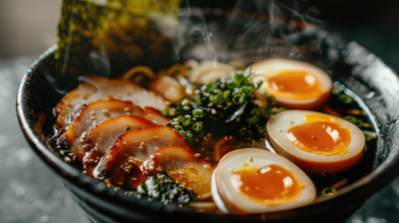 A steaming bowl of ramen featuring tender BBQ pork, soft-boiled eggs, and fresh green onions, perfect for a comforting meal or snack.