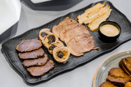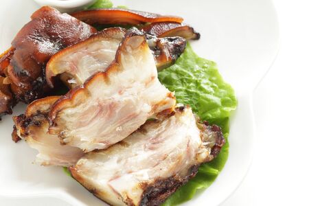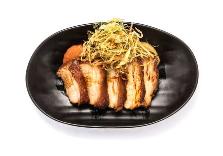 Sliced boiled pork belly on plate, asian style food
