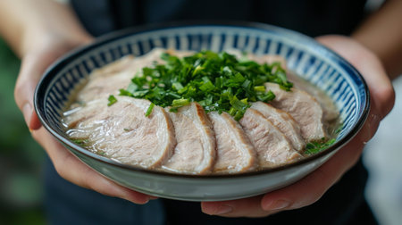 A beautifully presented bowl of sliced meat garnished with fresh green onions, exuding warmth and flavor, perfect for showcasing culinary delights and appetizing meals.