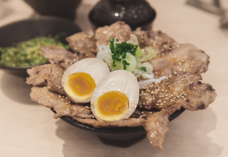 Rice cup with grilled pork and onzen egg in Japanese style food with indoor low lighting.
