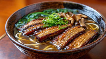 A mouth-watering bowl of ramen showcasing succulent pork slices, mushrooms, and fresh herbs in a rich savory broth. Perfect for food lovers!